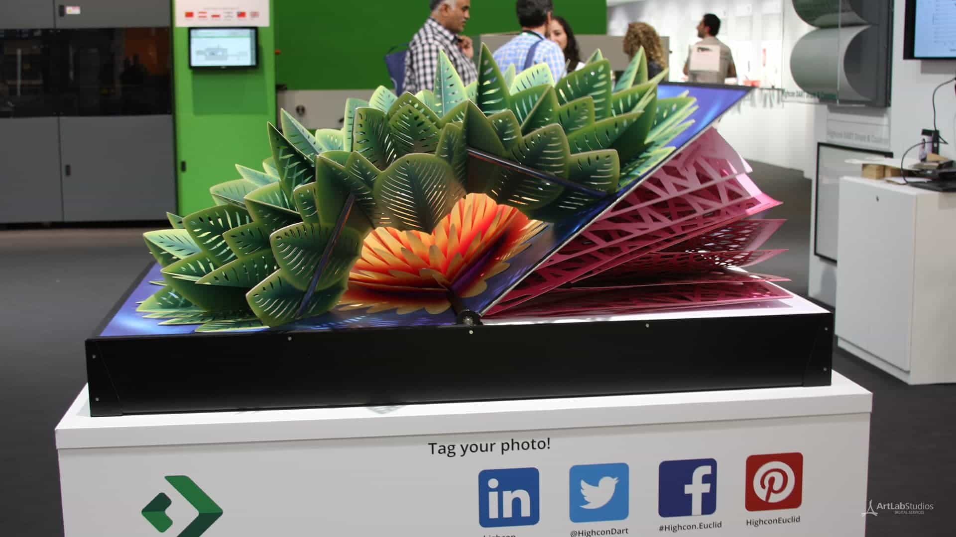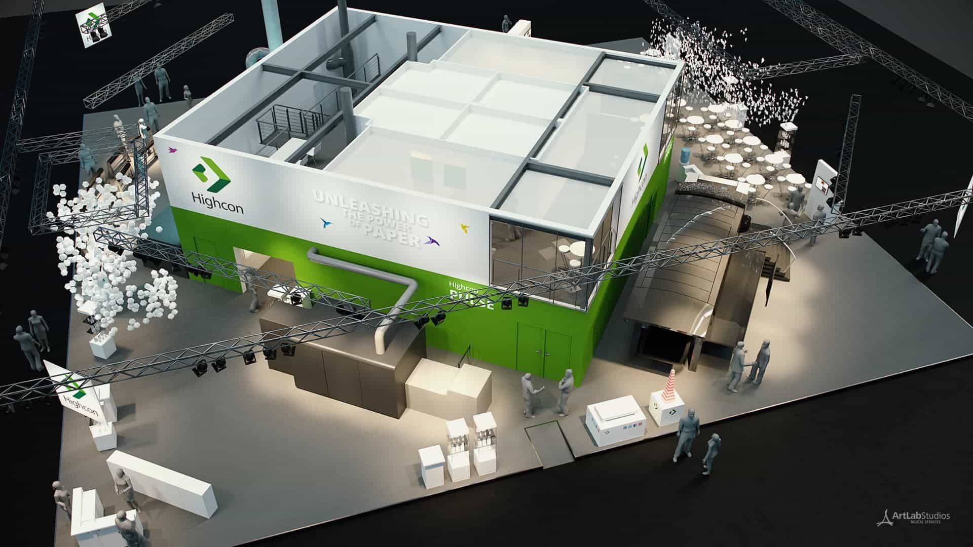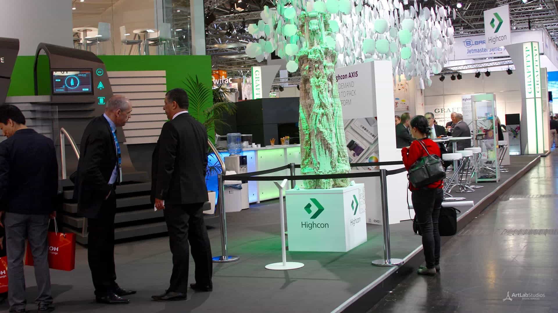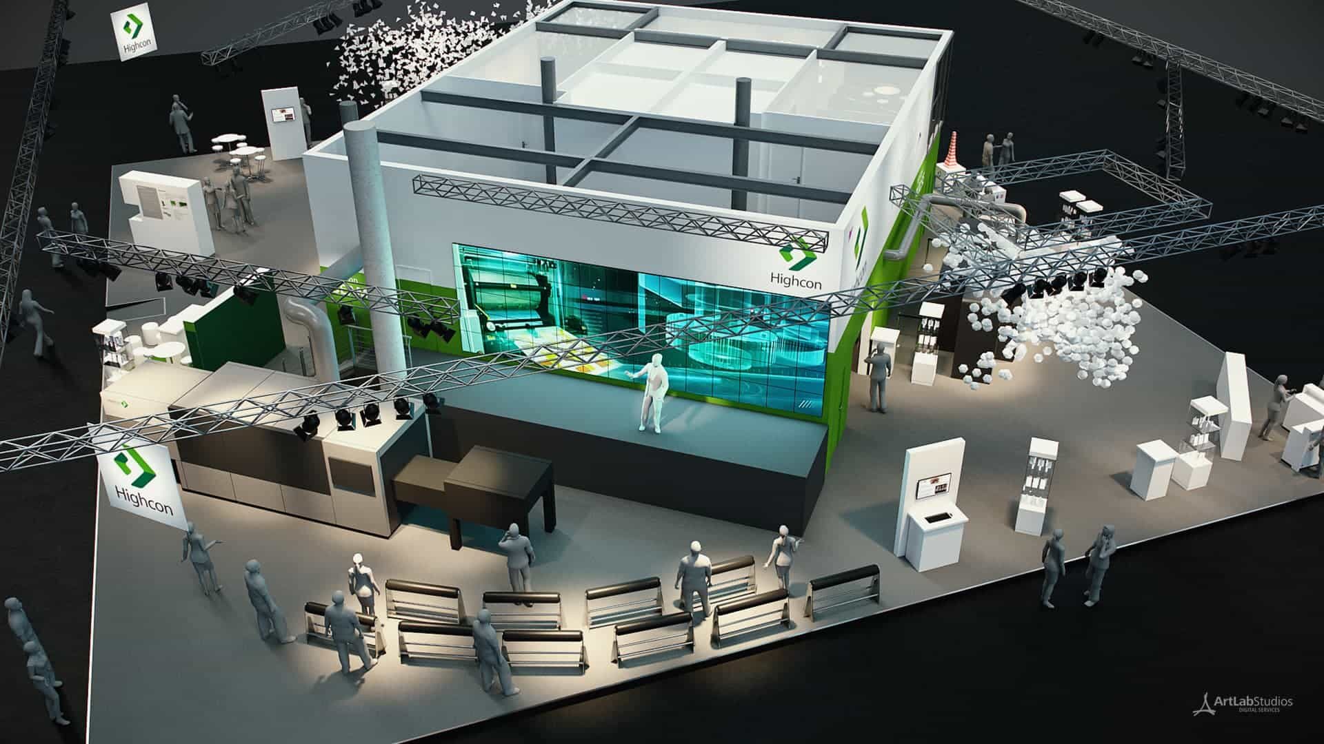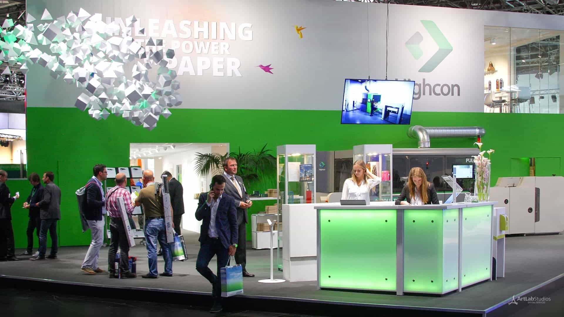 At Drupa 2016 in Düsseldorf, a 794 sqm trade fair stand was developed for Highcon. The scope included stand concept and design, graphic development, and full project execution. This encompassed detailed technical planning such as power, air, AV, exhaust, and lighting systems—ensuring a seamless and efficient trade show presence.