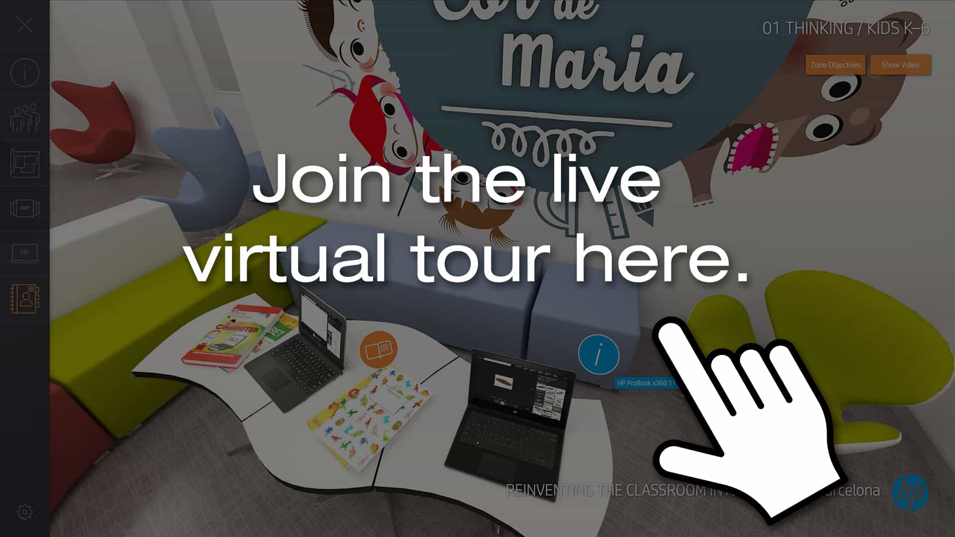 As part of HP's global educational initiative, this virtual project aimed to support the digital transformation of learning spaces through immersive technologies. Two existing classrooms in Spain were meticulously captured and recreated as highly realistic virtual environments using advanced IT concepts, 3D Max modeling, and programming in 3D Vista. Integrated with HTML5 web technology and dynamic content via a content management component (CMC), the experience allowed for seamless online navigation. Supplementary video footage of the physical classrooms added context, and a version optimized for HP Reverb VR glasses ensured compatibility with immersive VR platforms—bridging real and digital education environments.